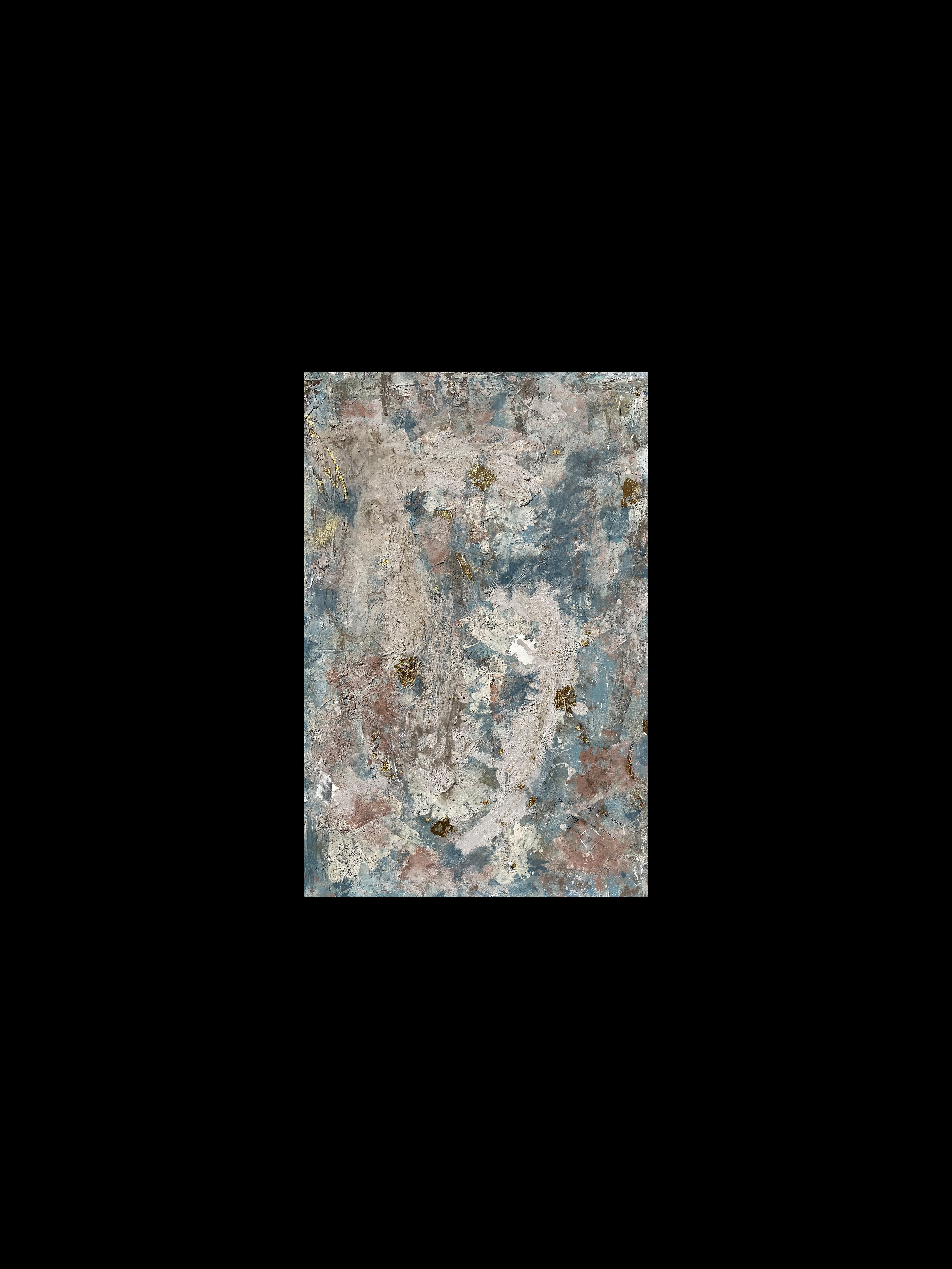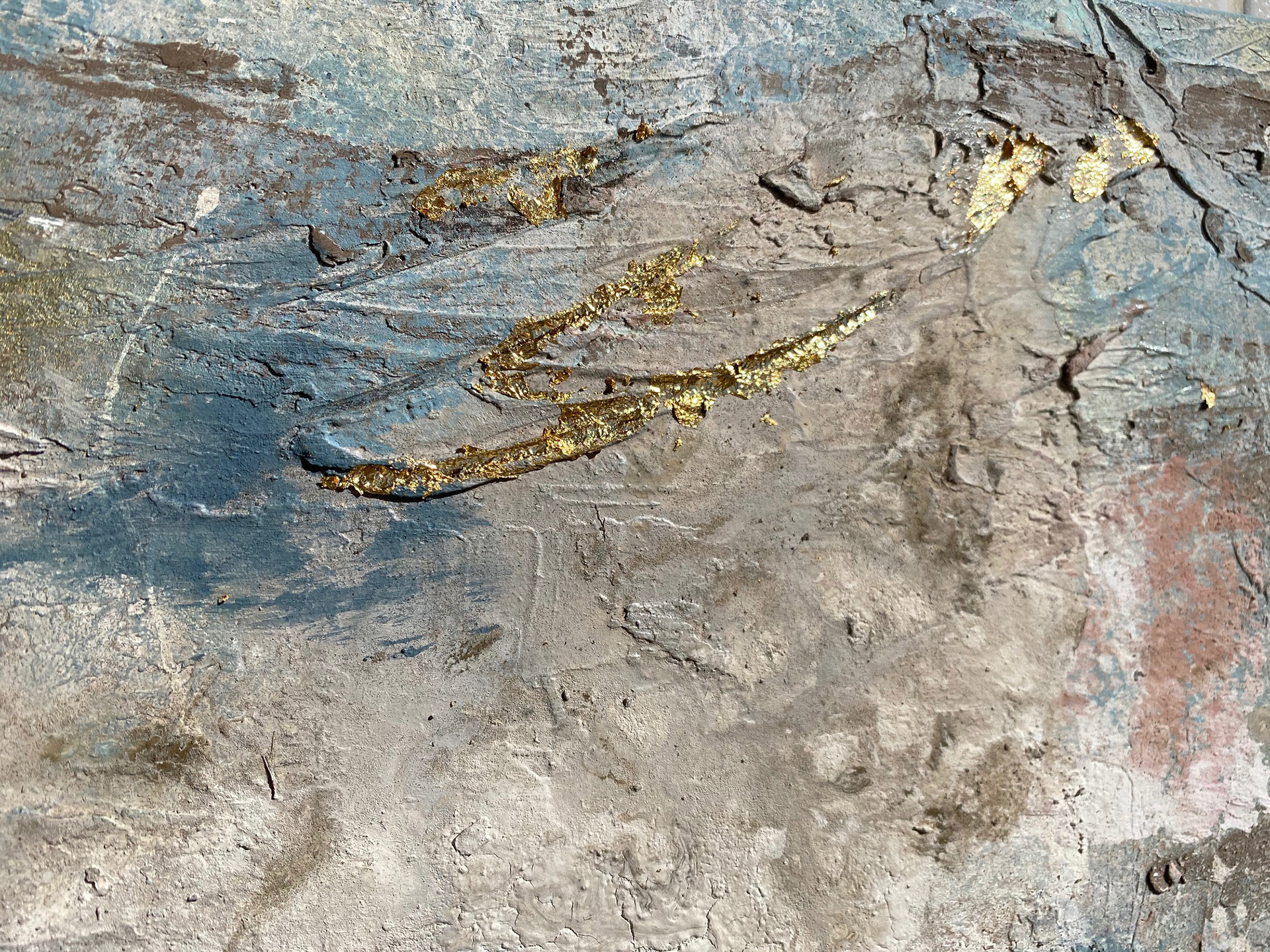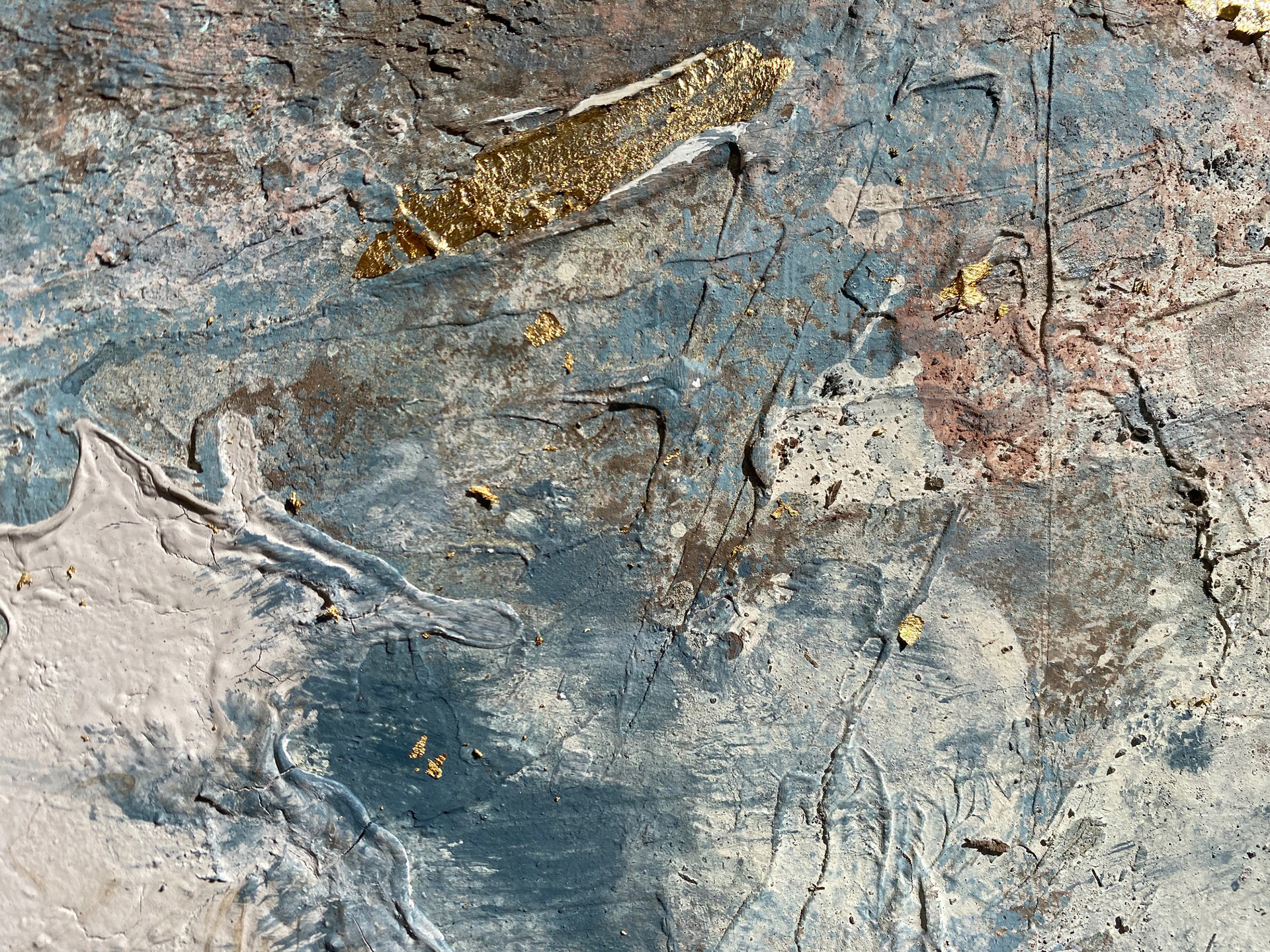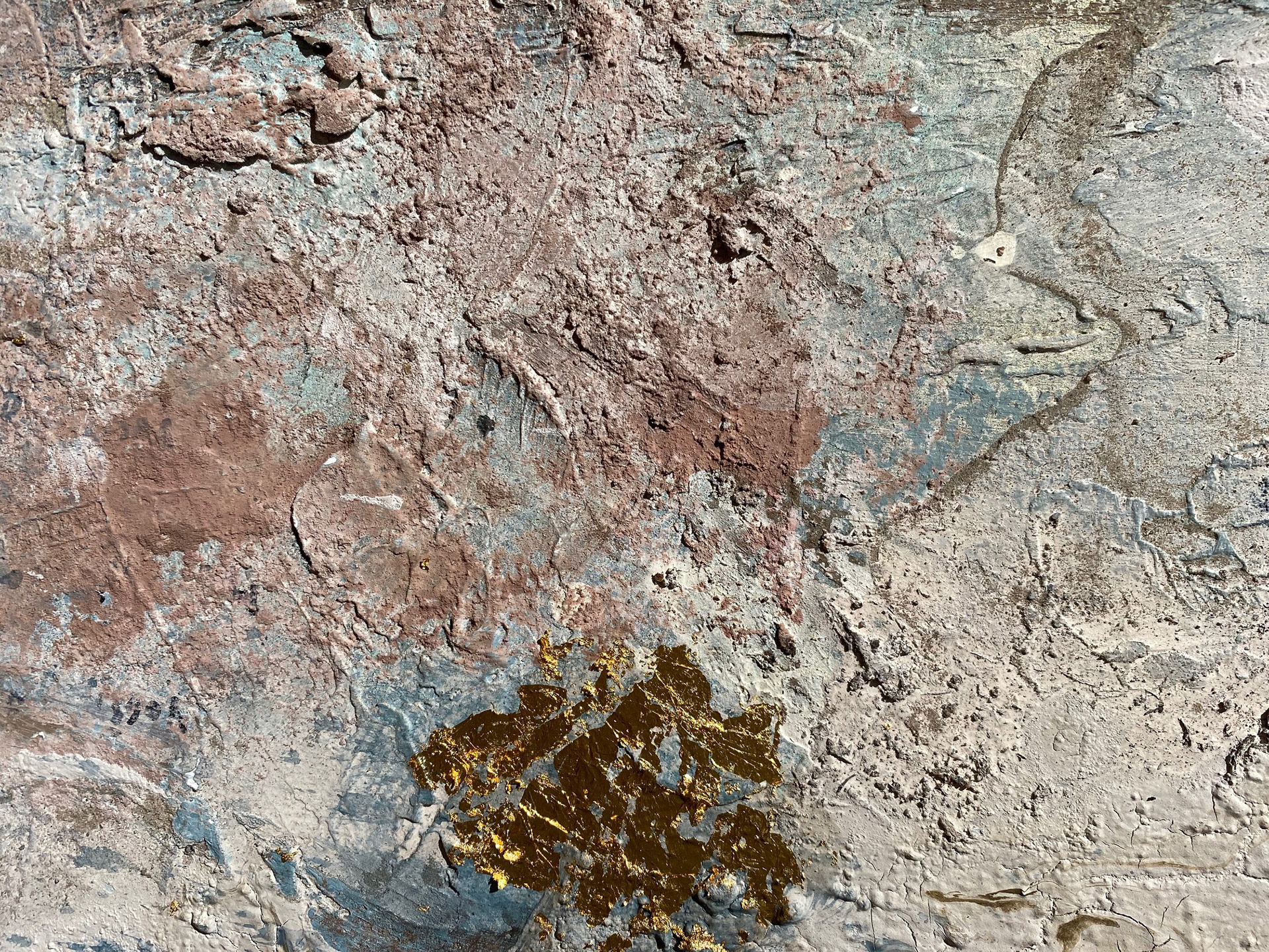120 x 80 cm. Tinta acrílica, spray, massa corrida, areia, terra & folha de ouro sob tela.