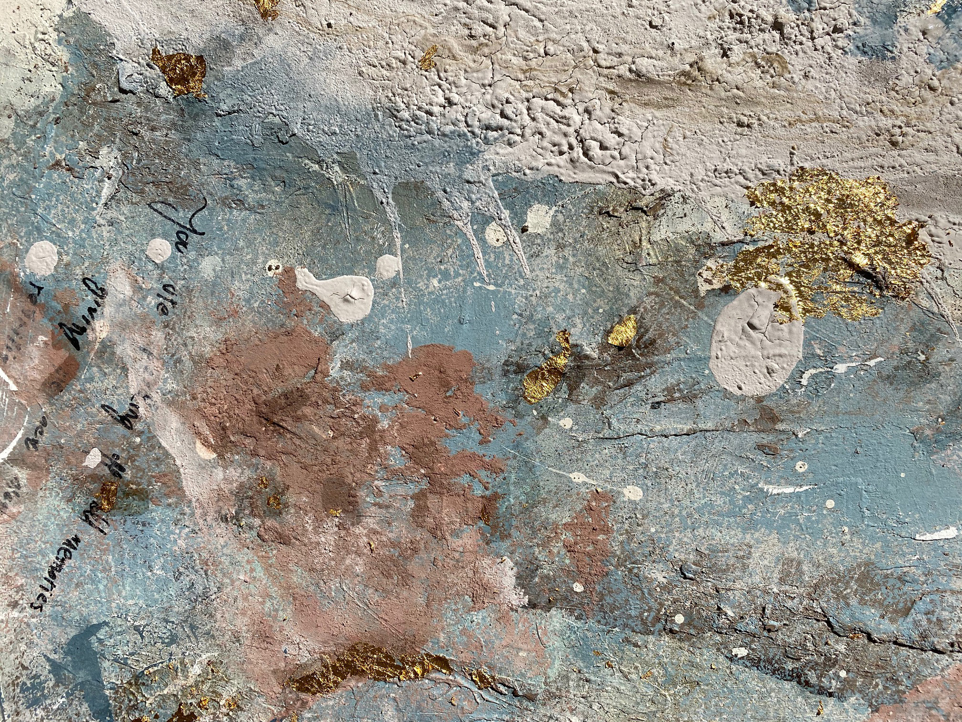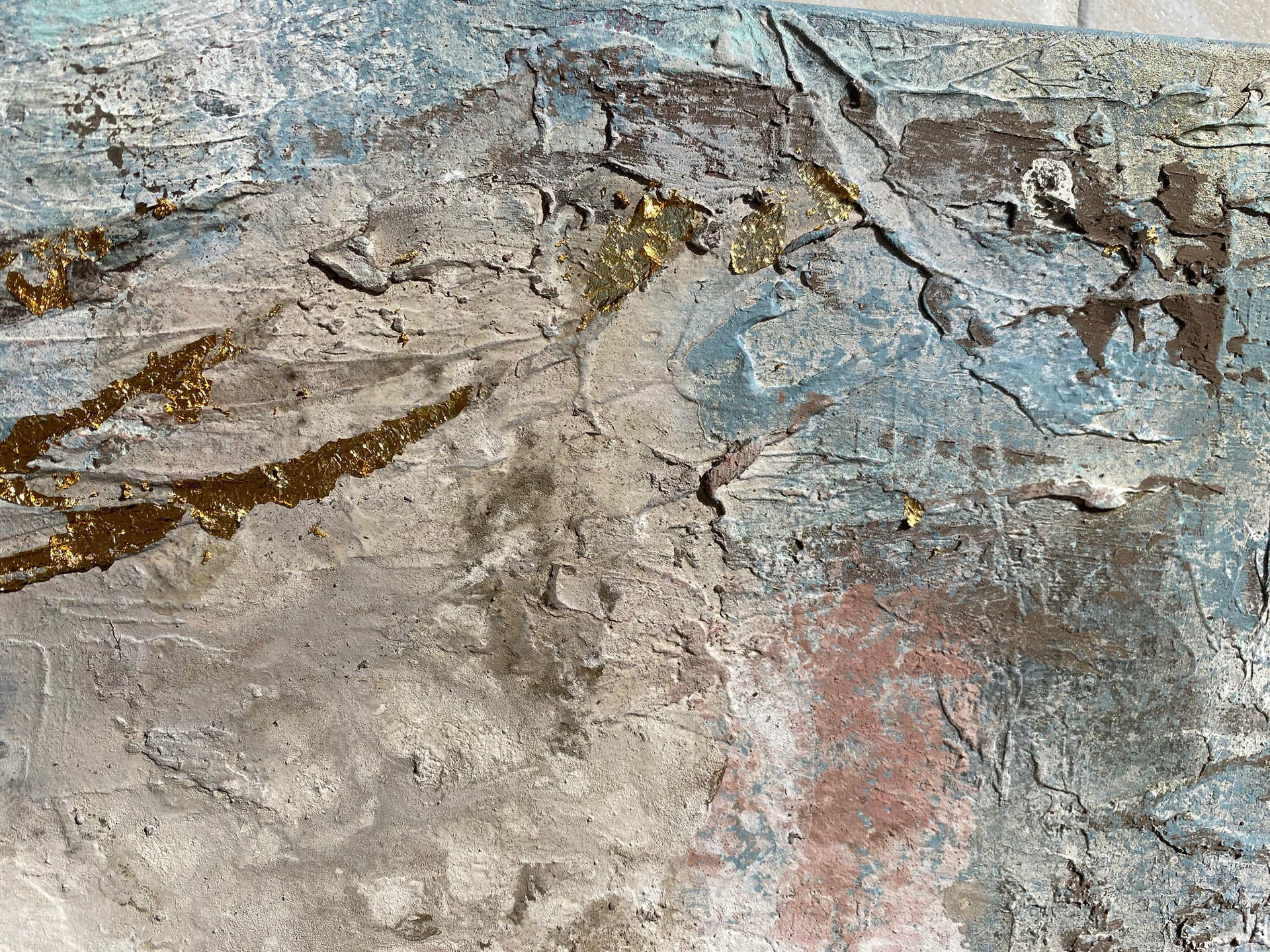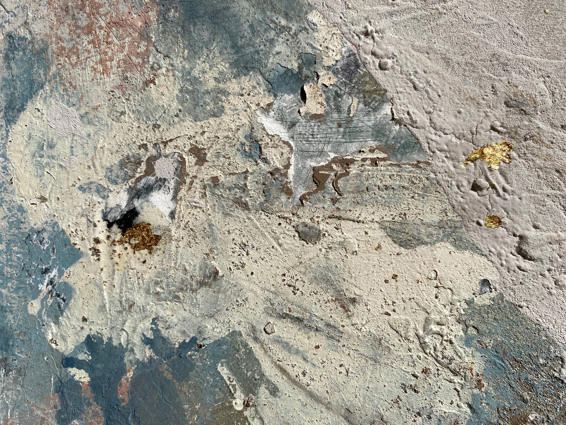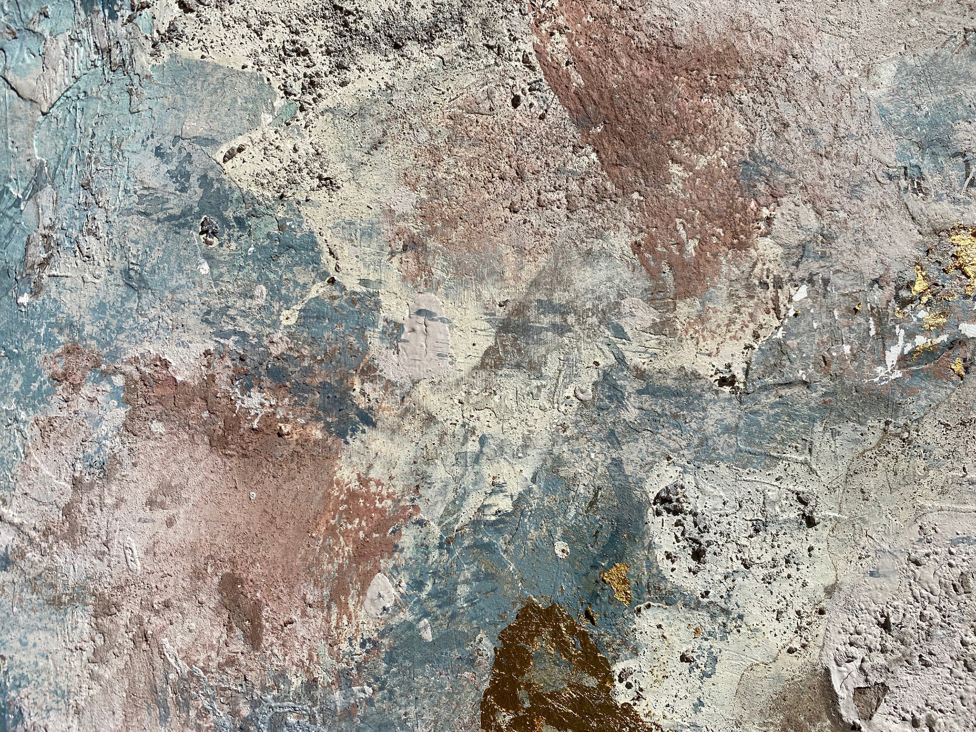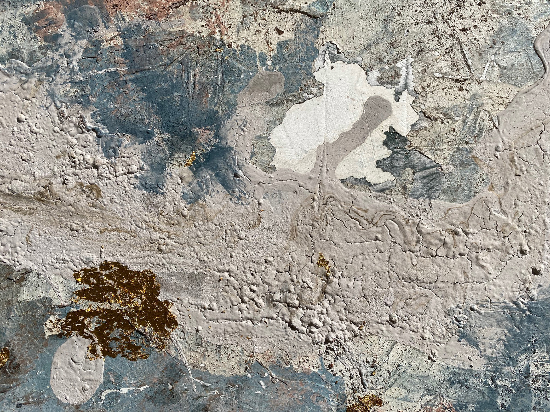 120 x 80 cm. Tinta acrílica, spray, massa corrida, areia, terra & folha de ouro sob tela.