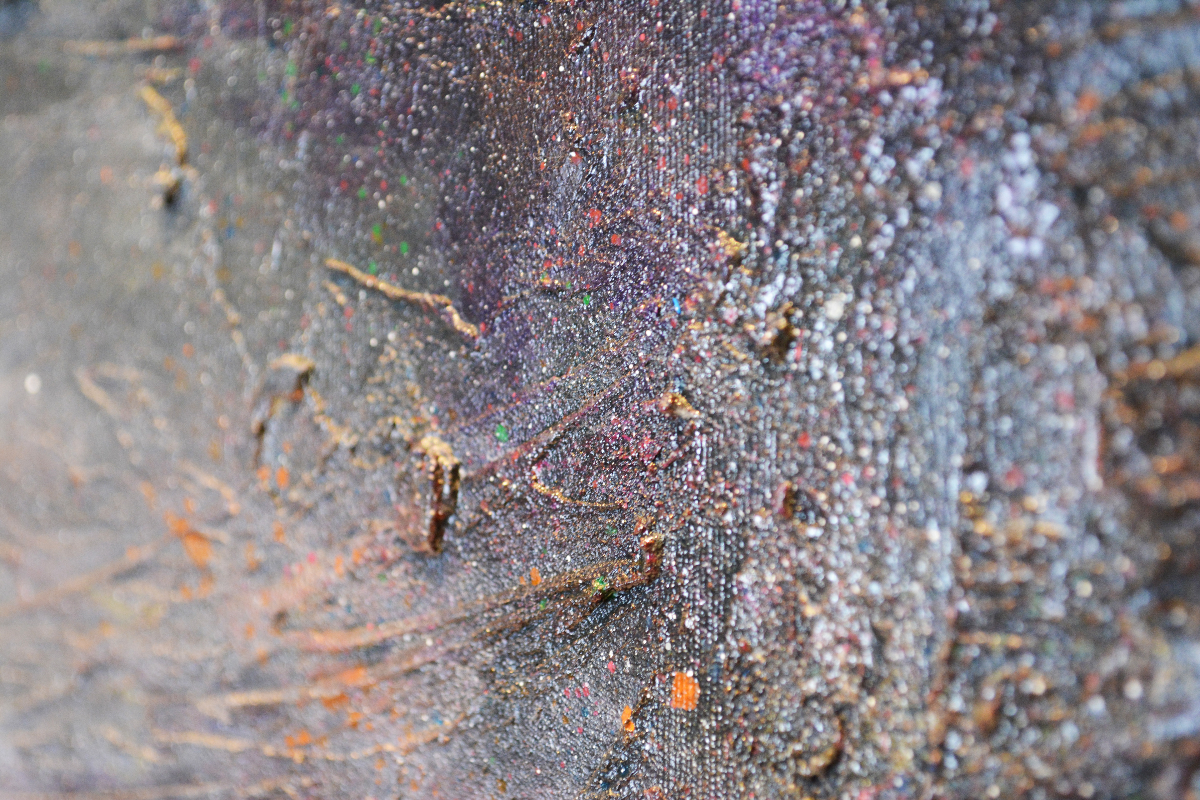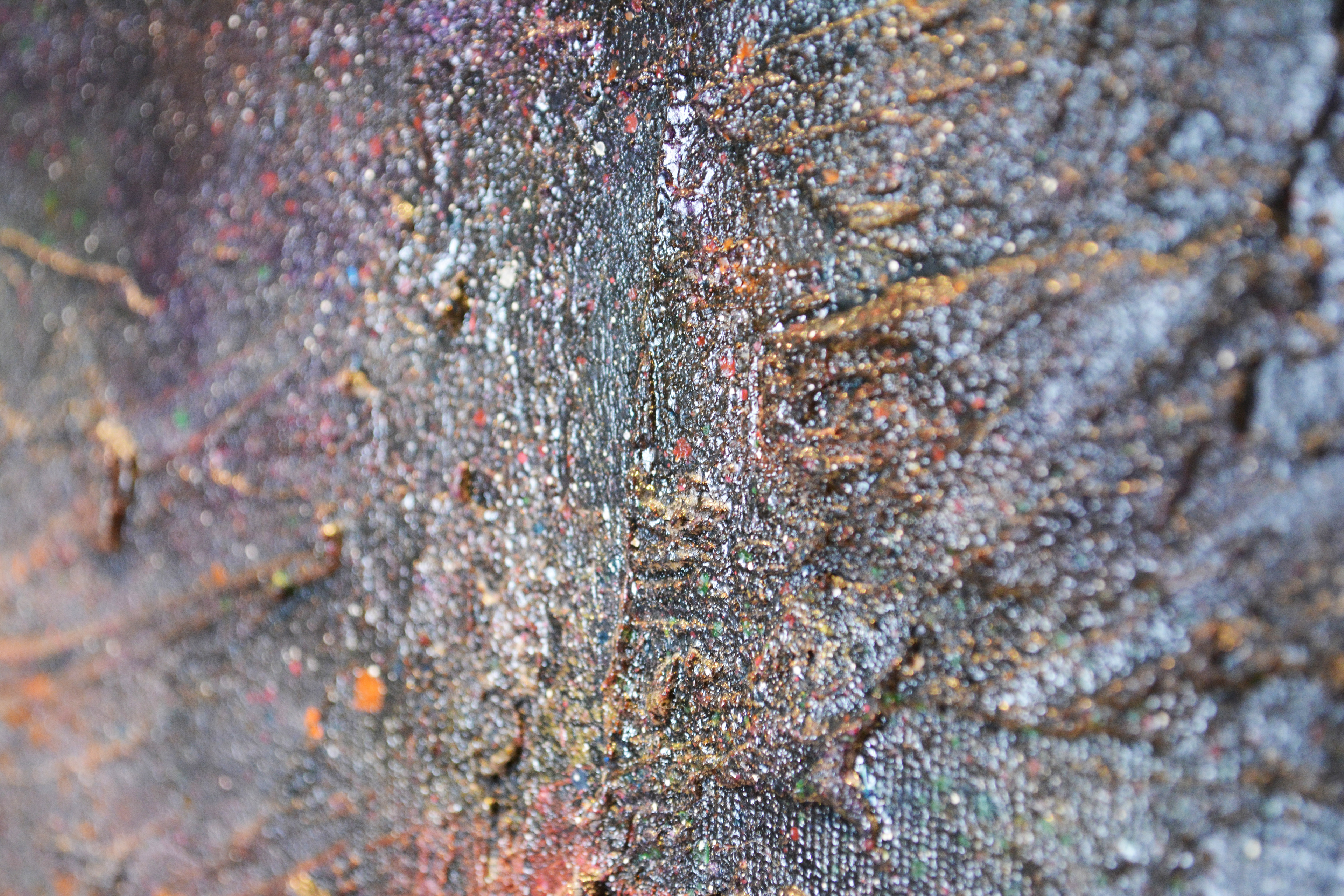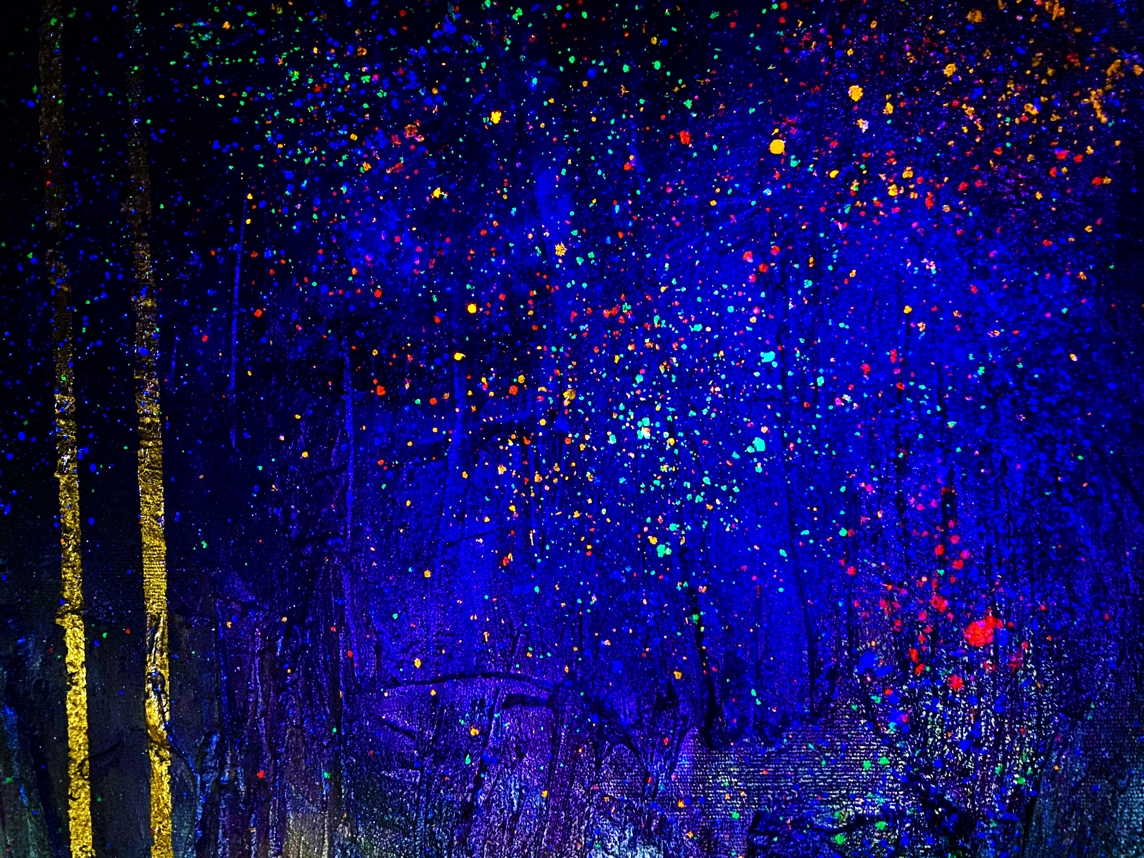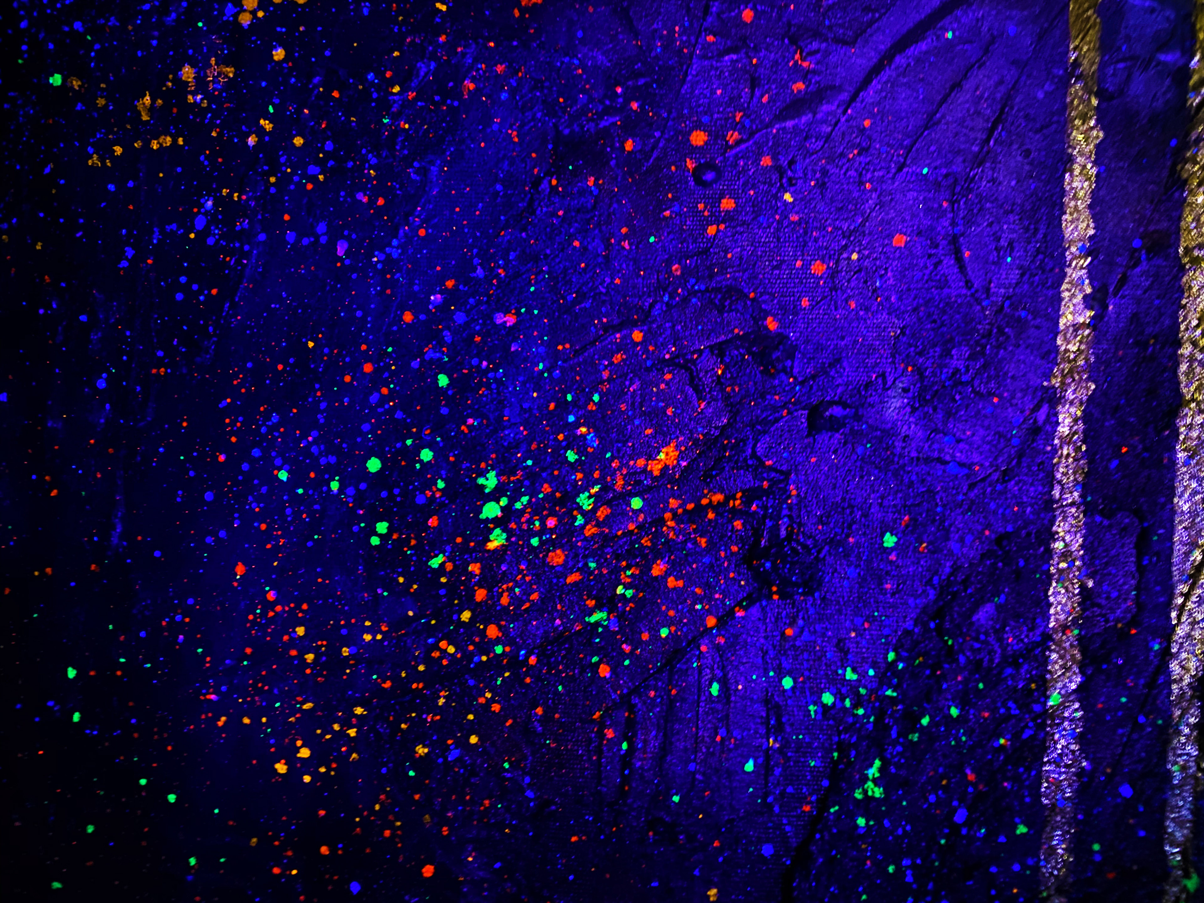 100 x 60 cm. Tinta acrílica, spray, nanquim fluorescente, concreto, cera & folha de ouro sob tela. Essa obra tem cores que iluminam debaixo de luz negra.