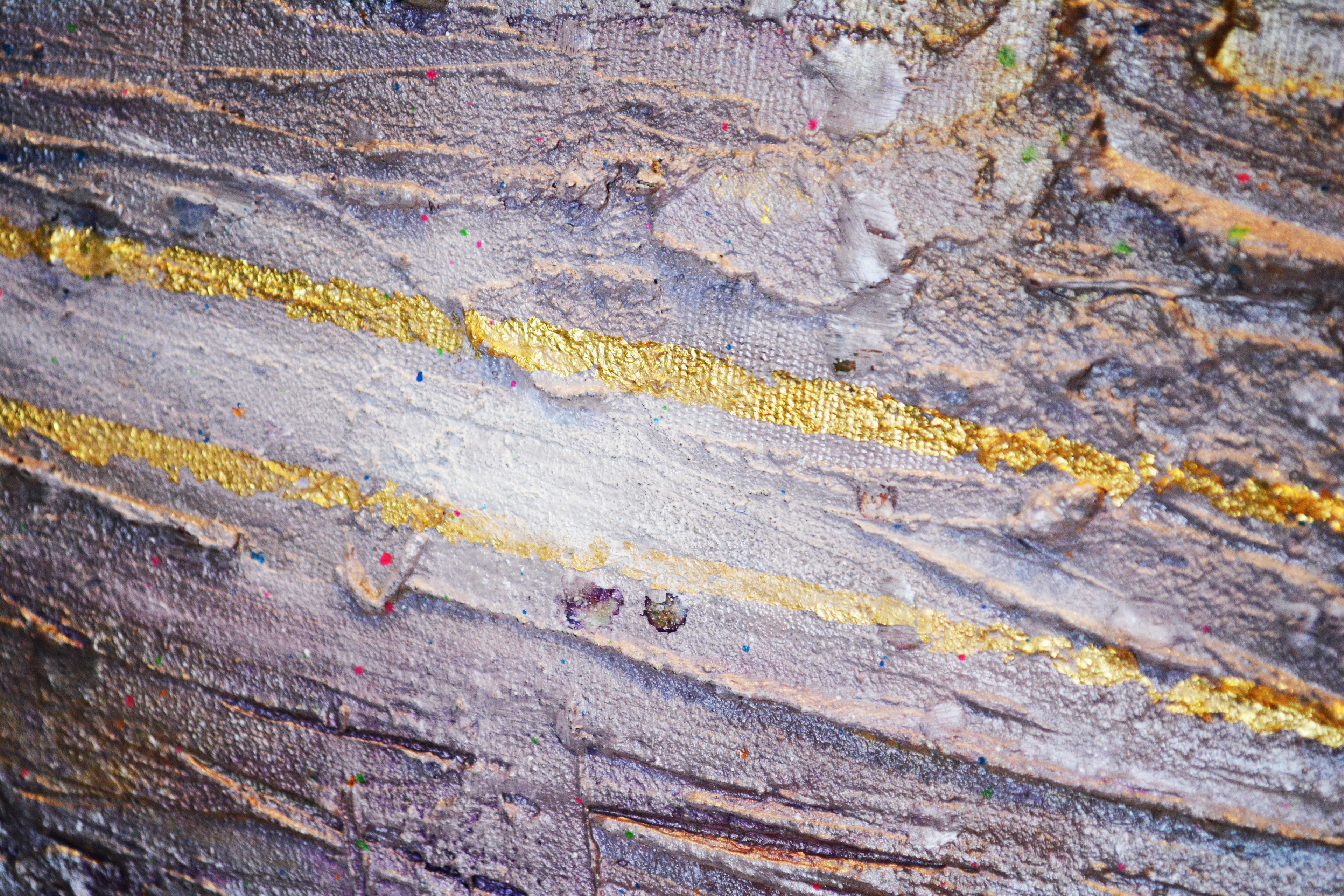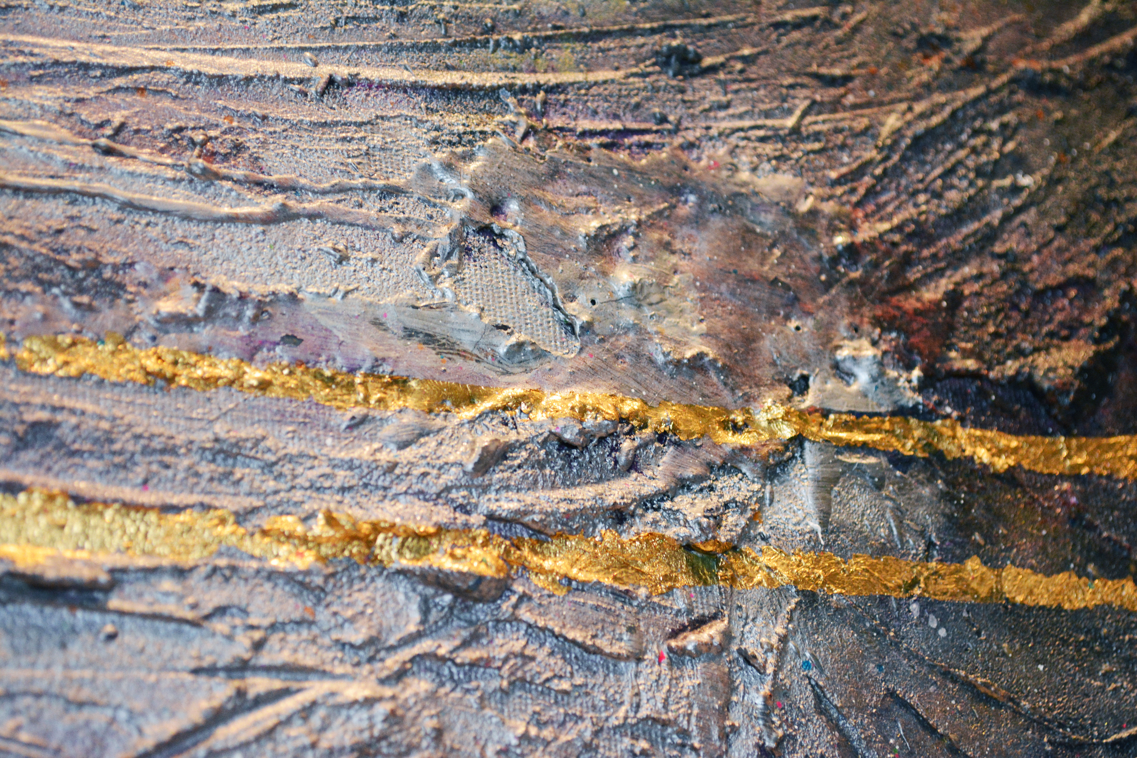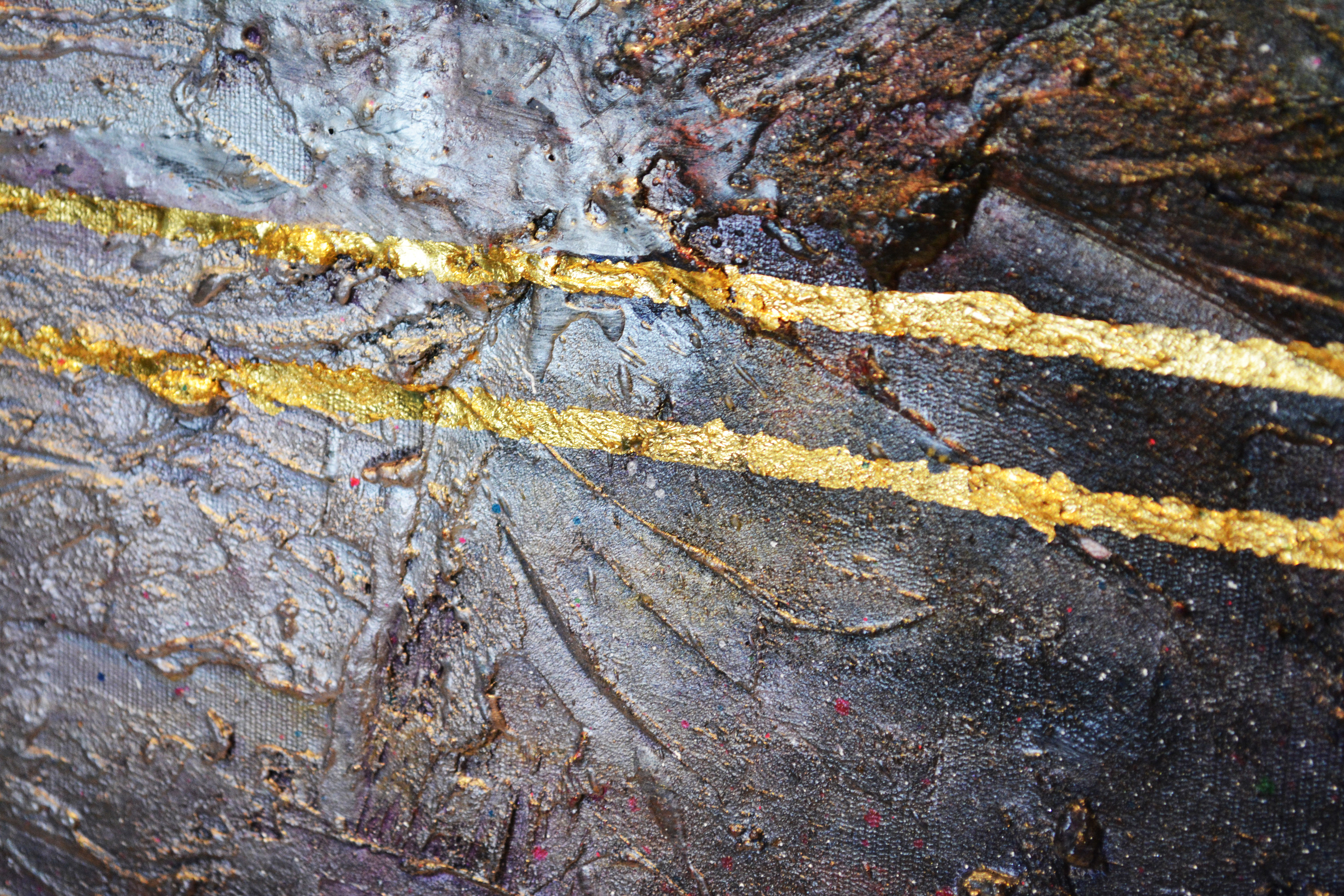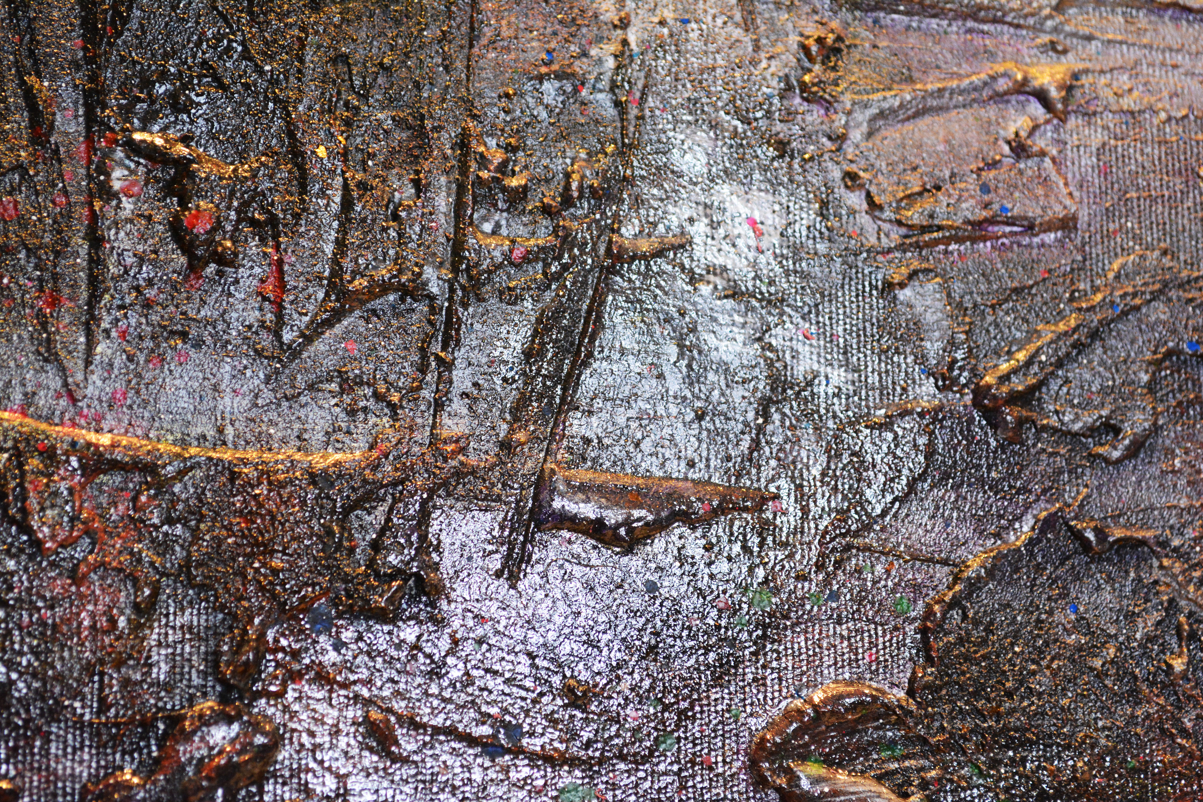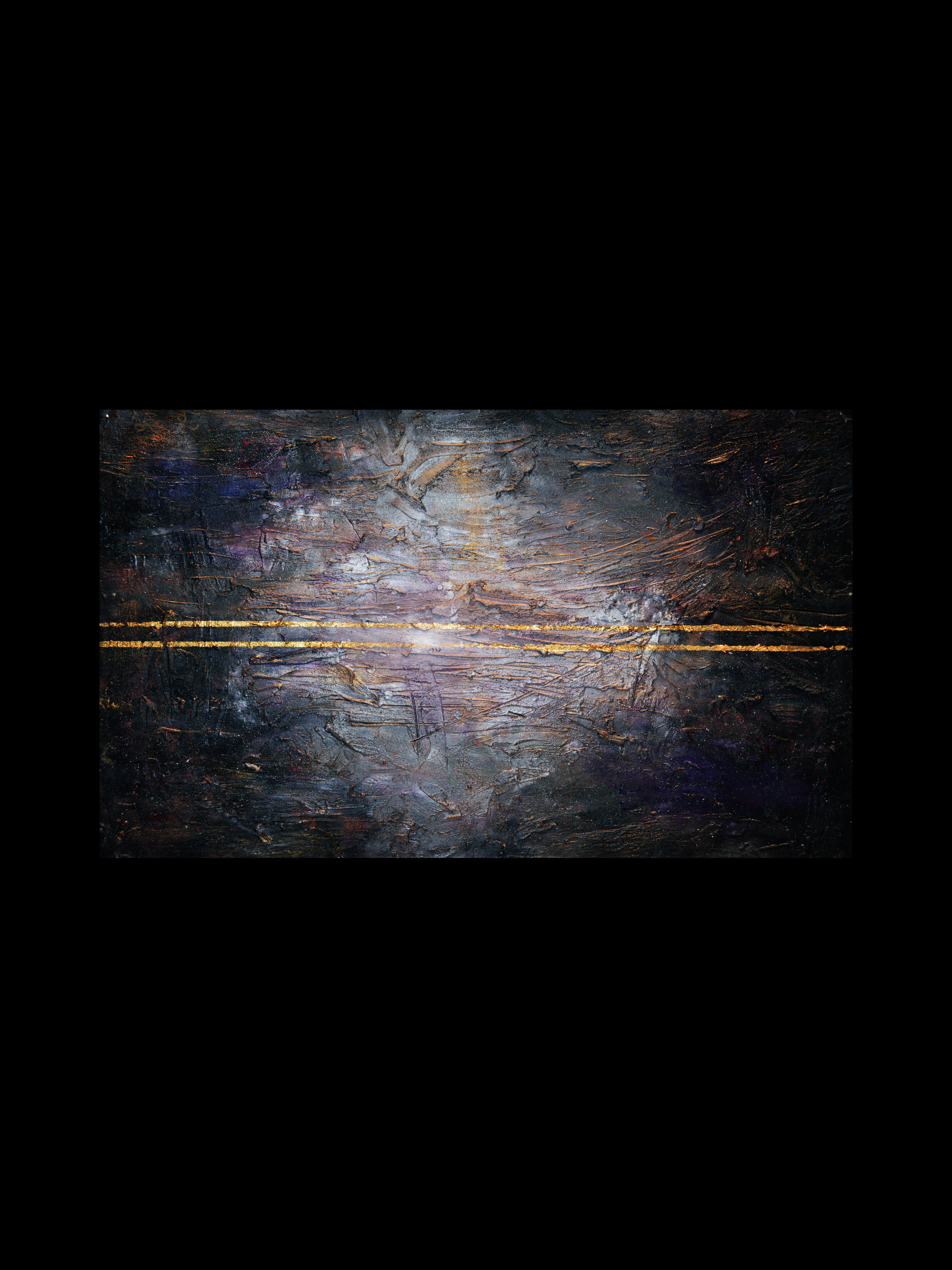 100 x 60 cm. Tinta acrílica, spray, nanquim fluorescente, concreto, cera & folha de ouro sob tela. Essa obra tem cores que iluminam debaixo de luz negra.