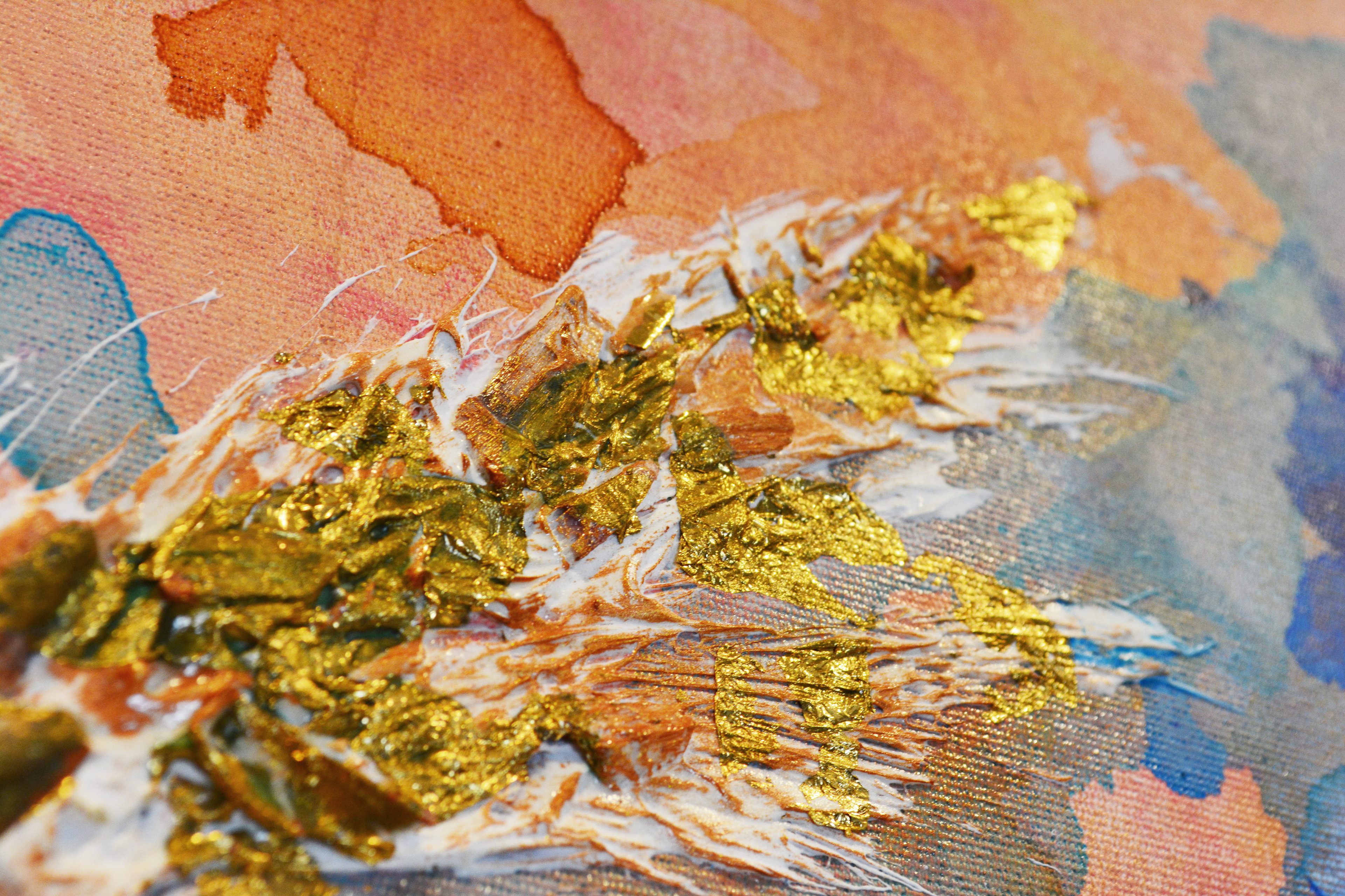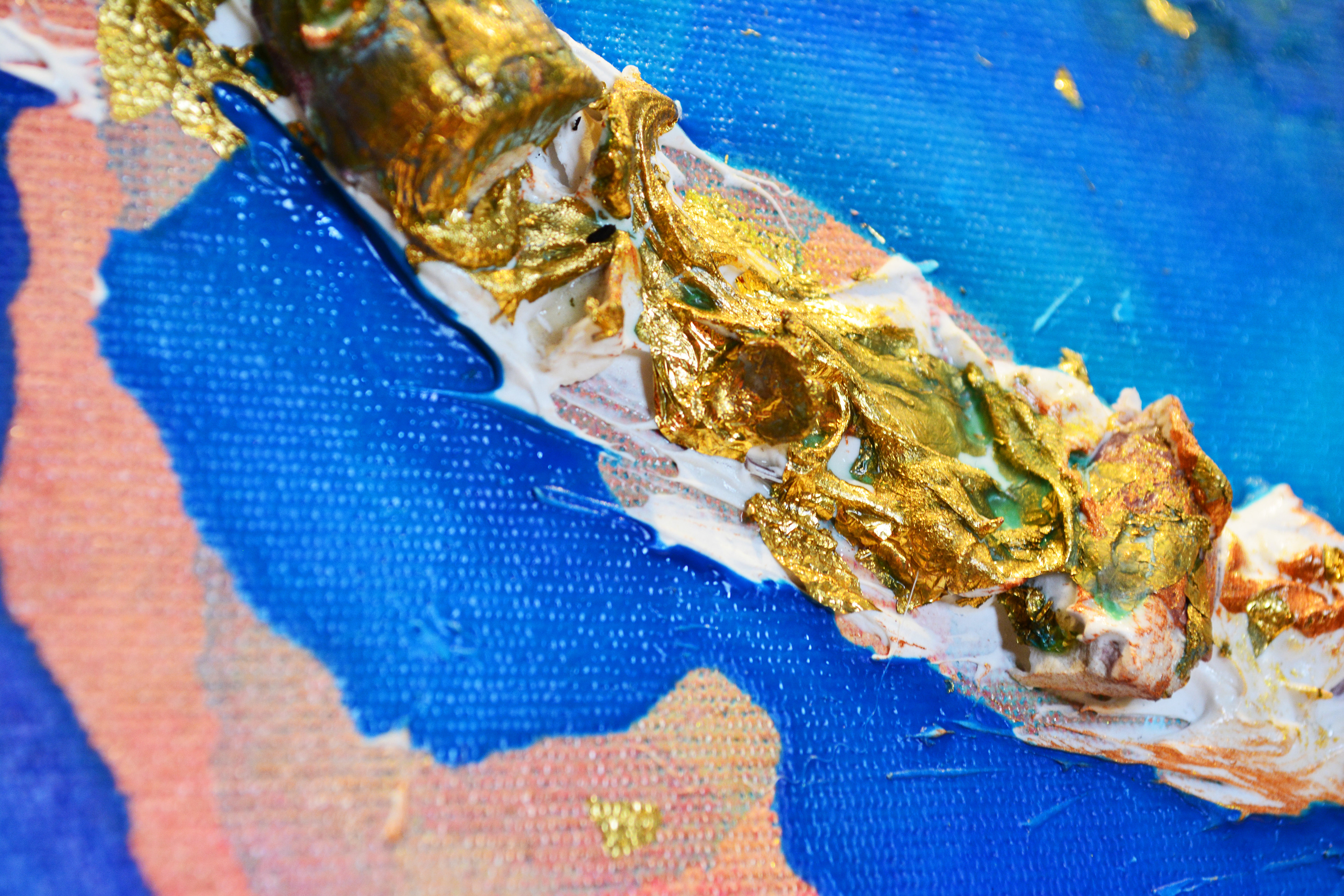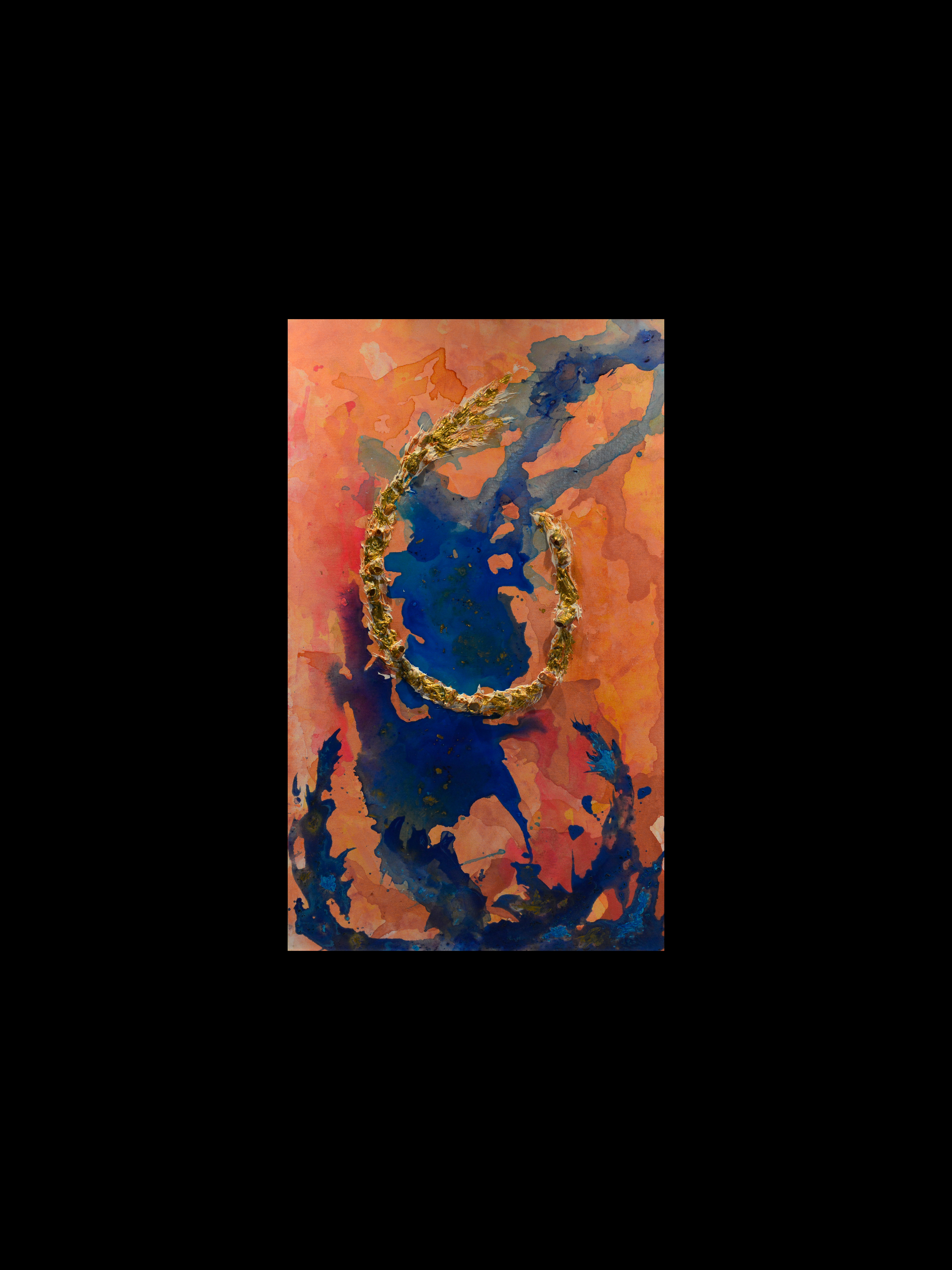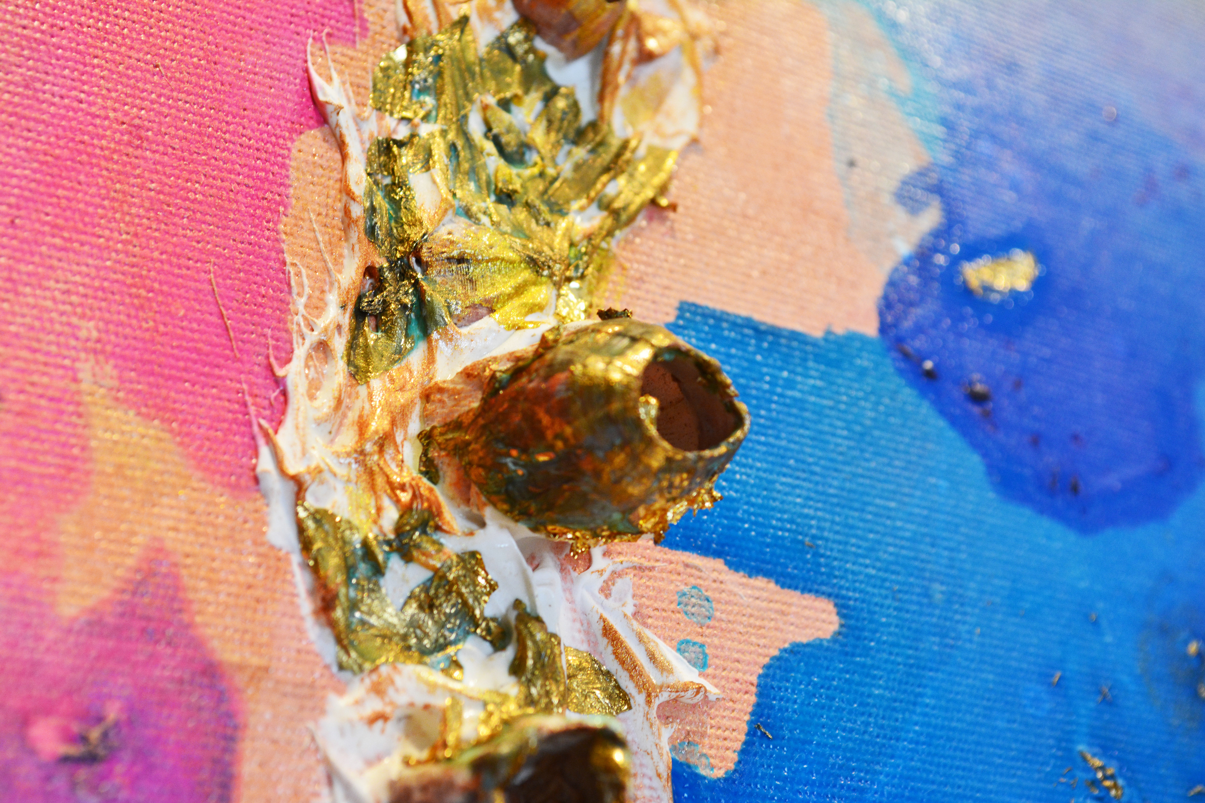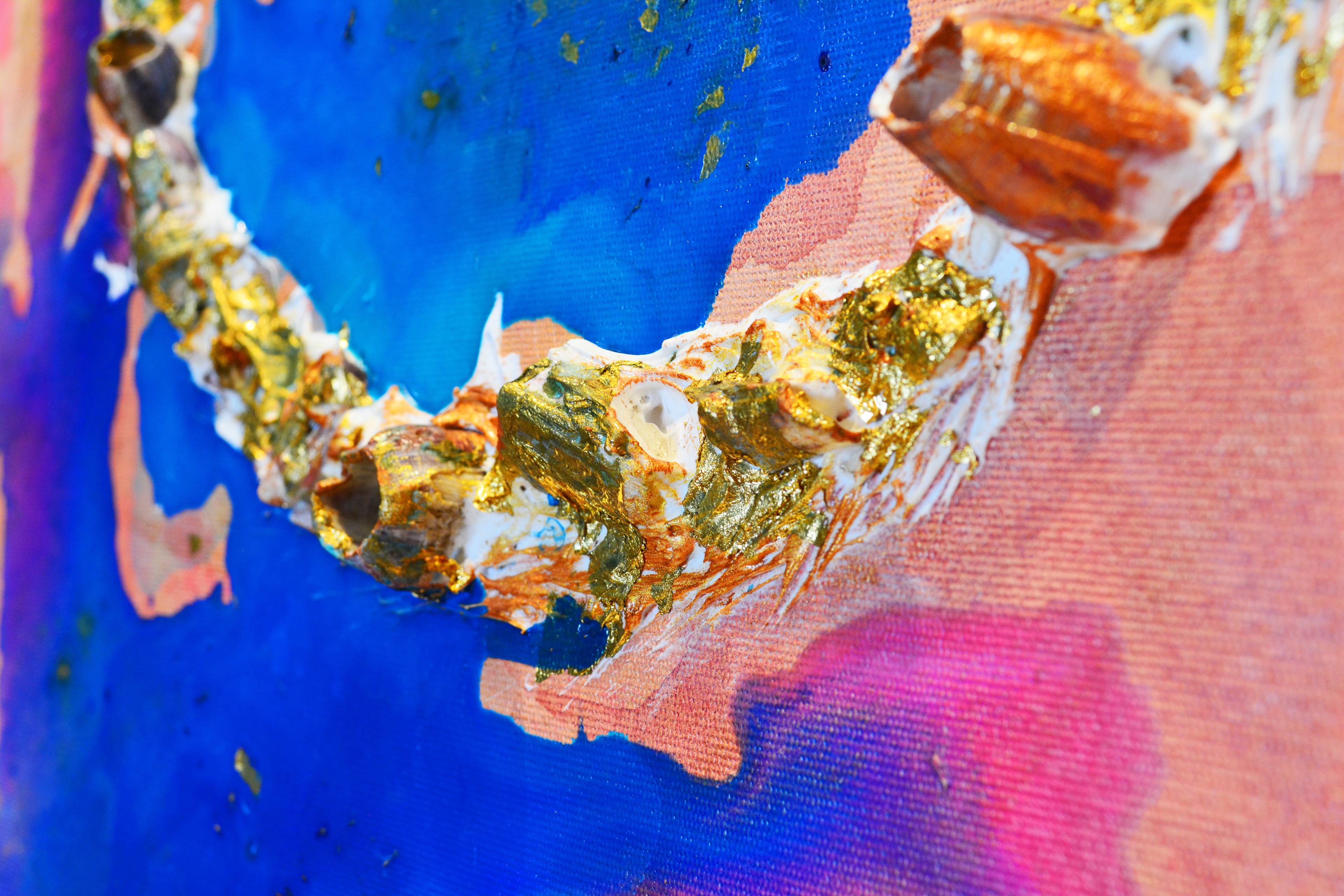 60 x 100 cm. Tinta acrílica, massa corrida, conchas e folha de ouro sob tela.