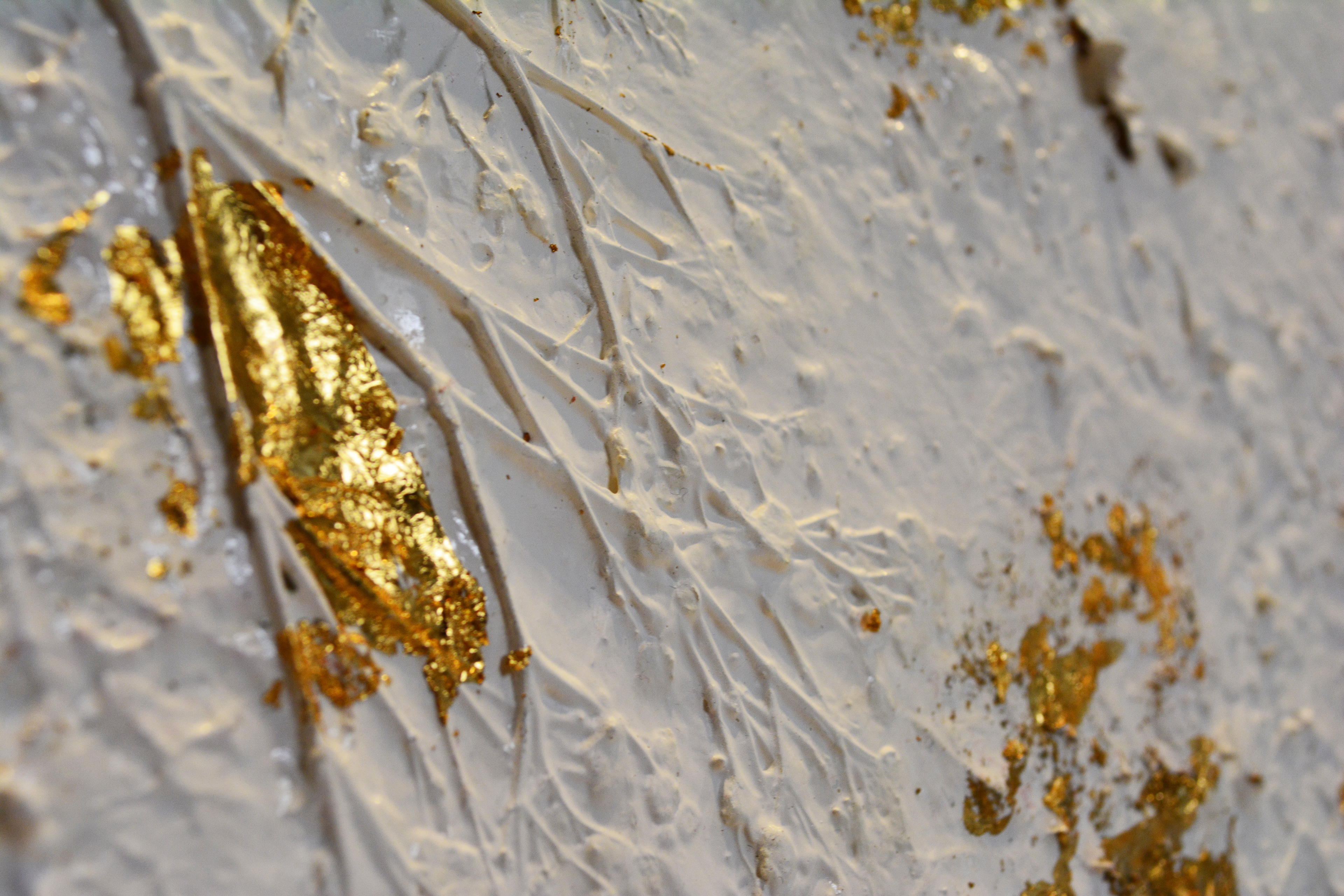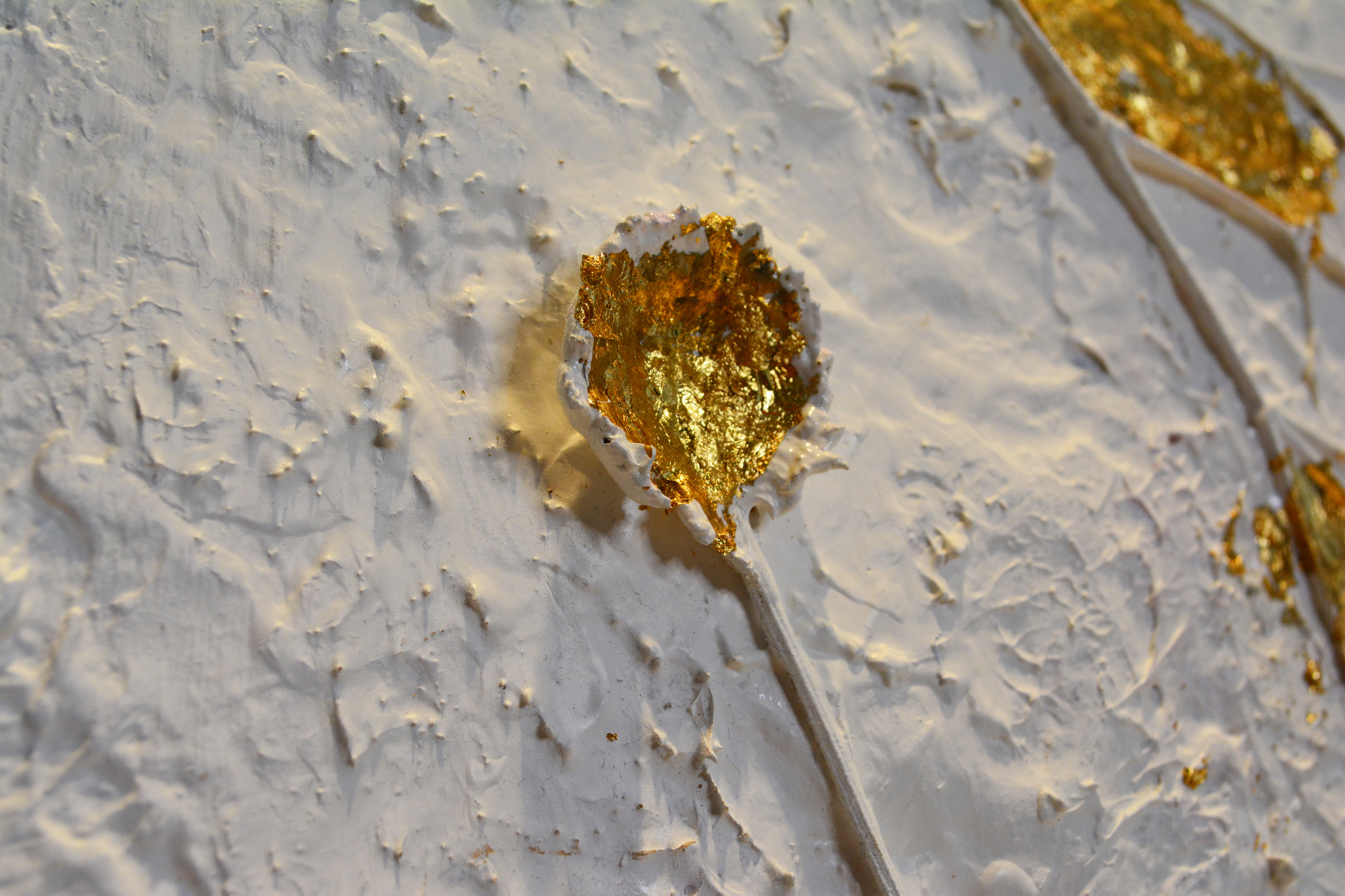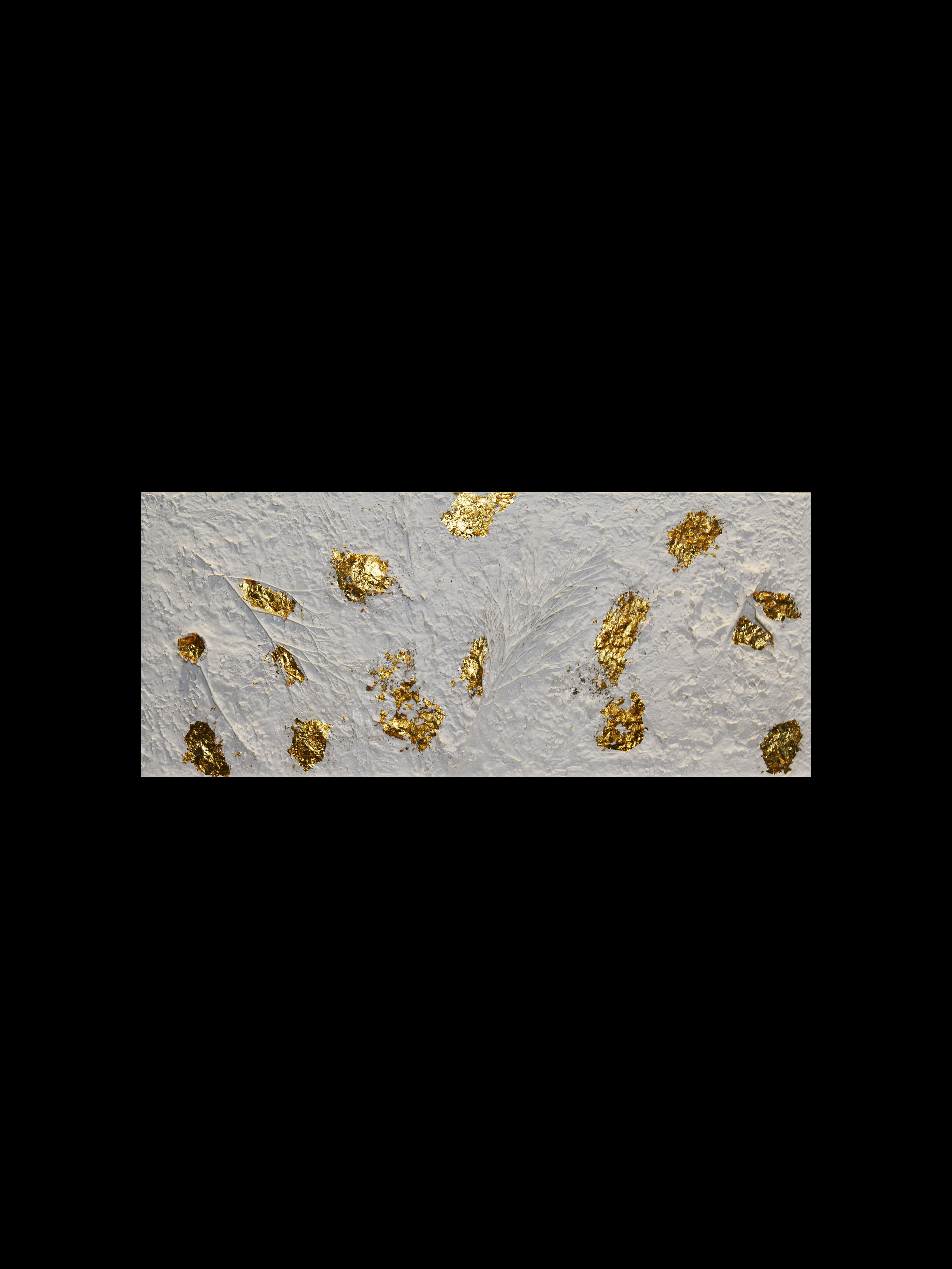 70 x 30 cm. Tinta acrílica, massa corrida, flores secas & folha de ouro sob tela.