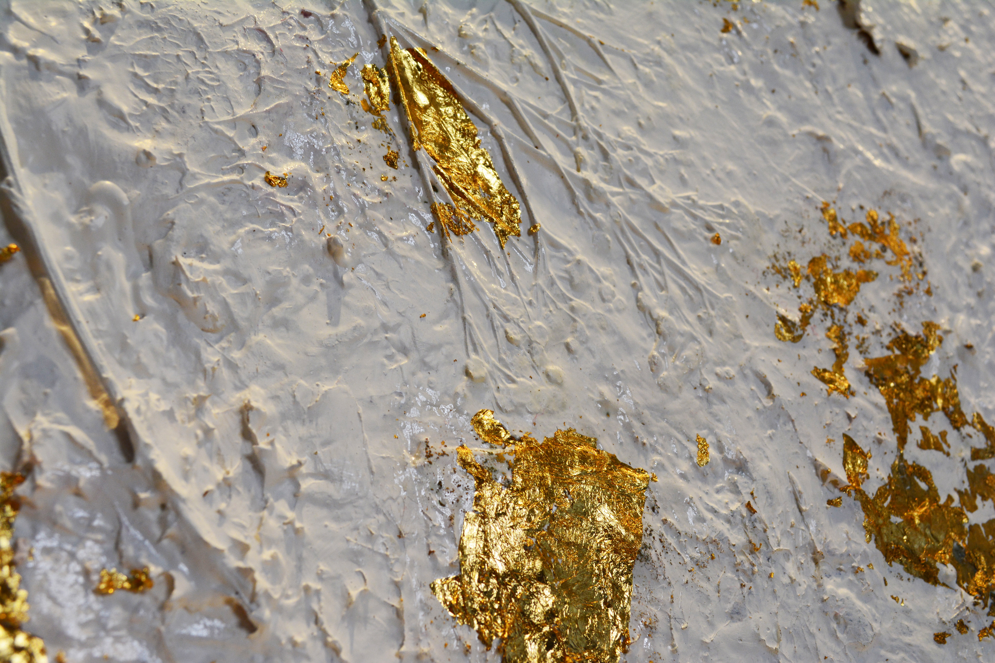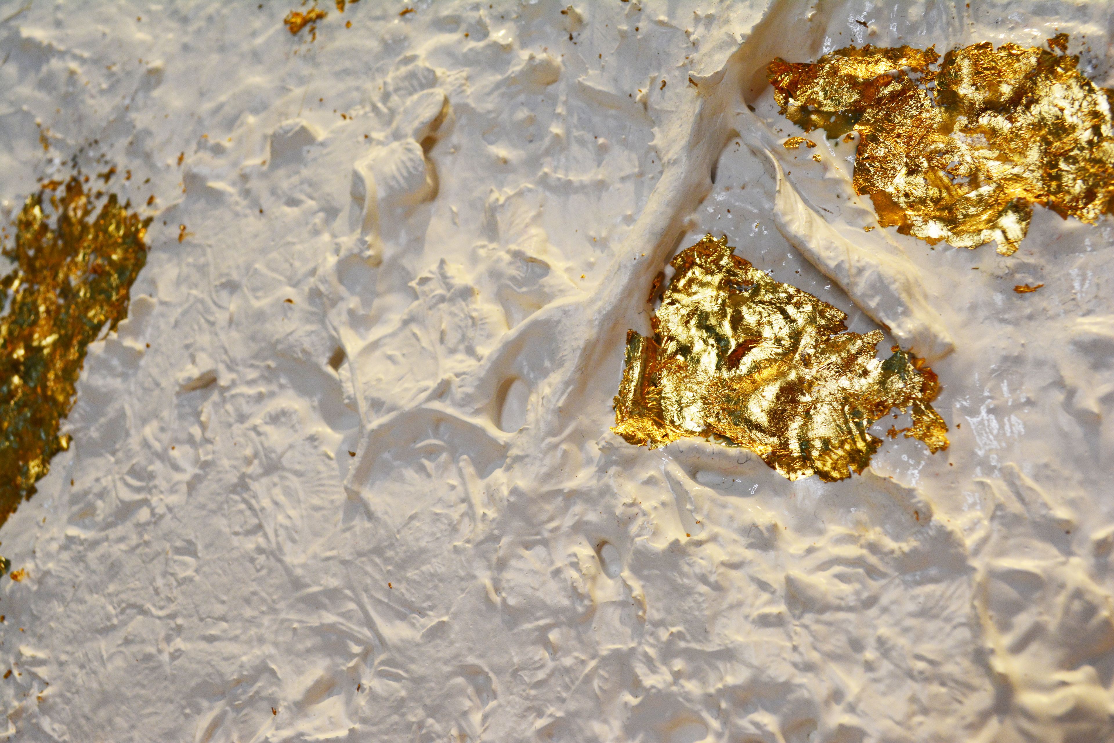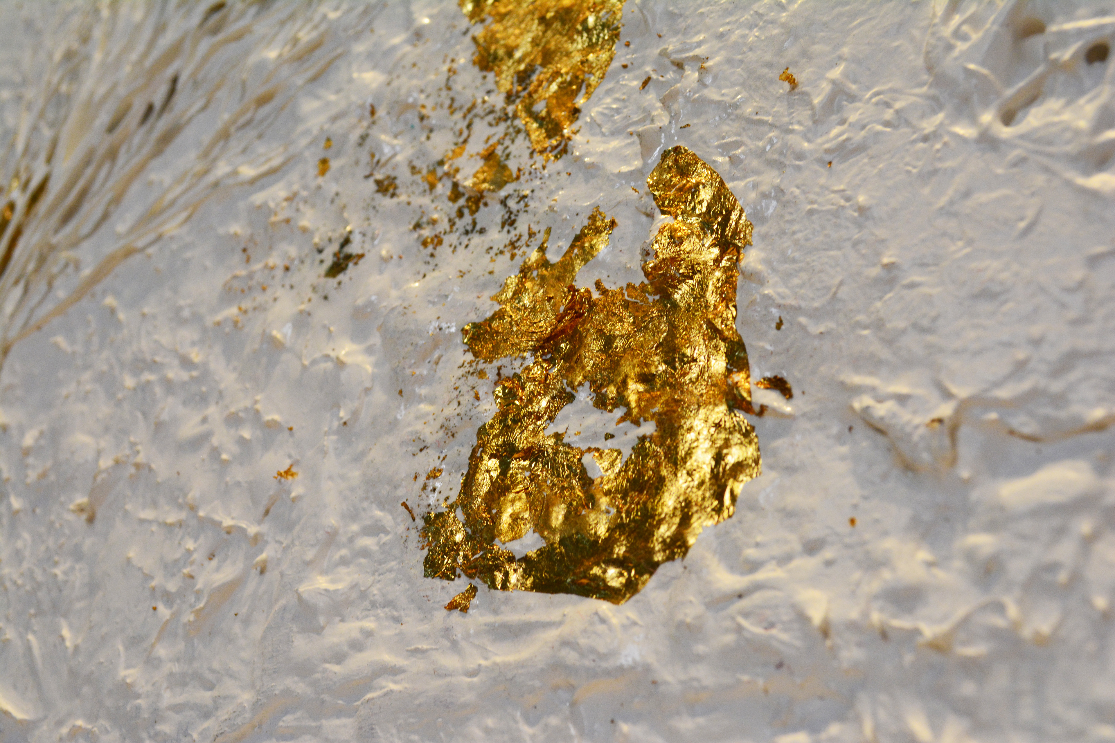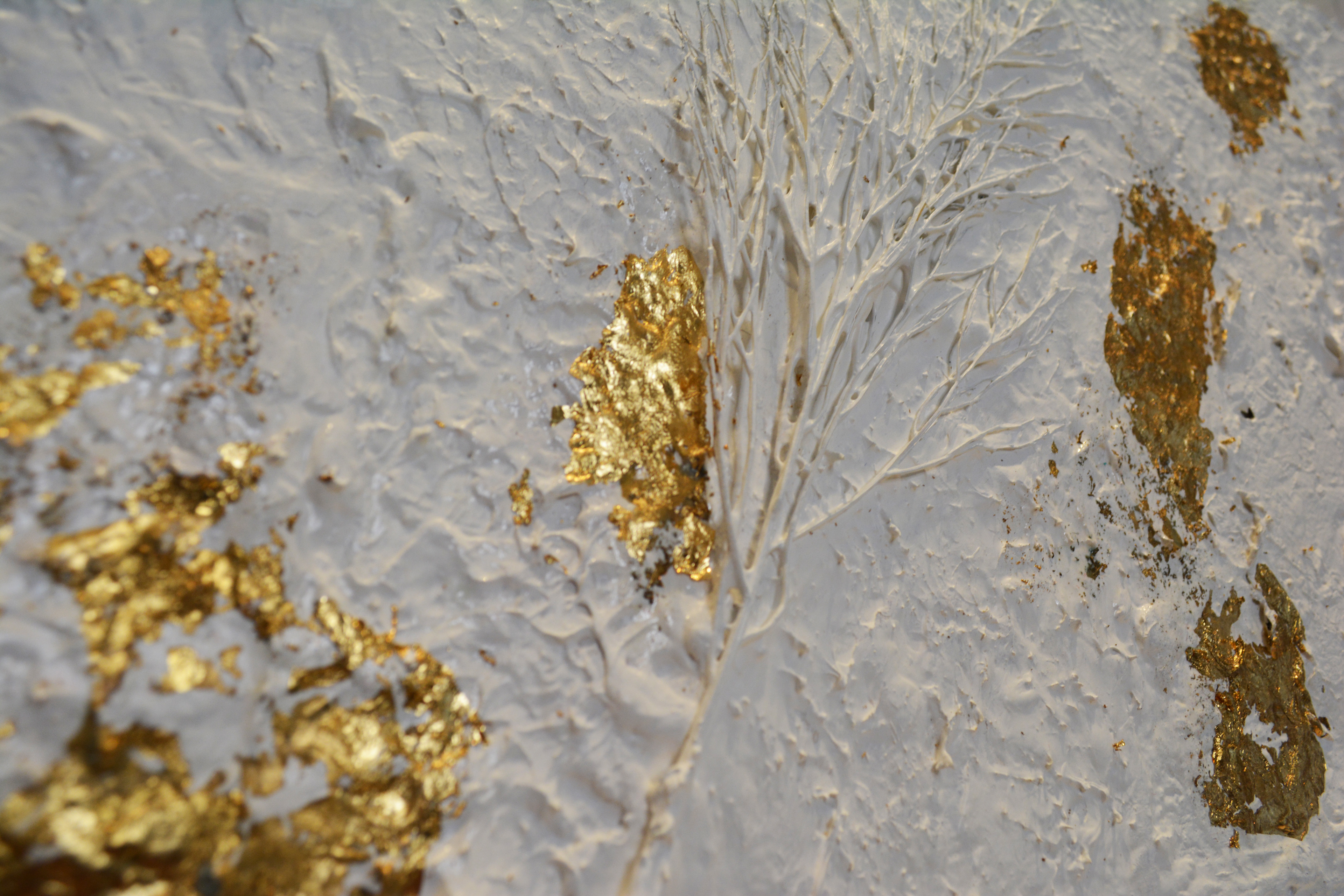 70 x 30 cm. Tinta acrílica, massa corrida, flores secas & folha de ouro sob tela.